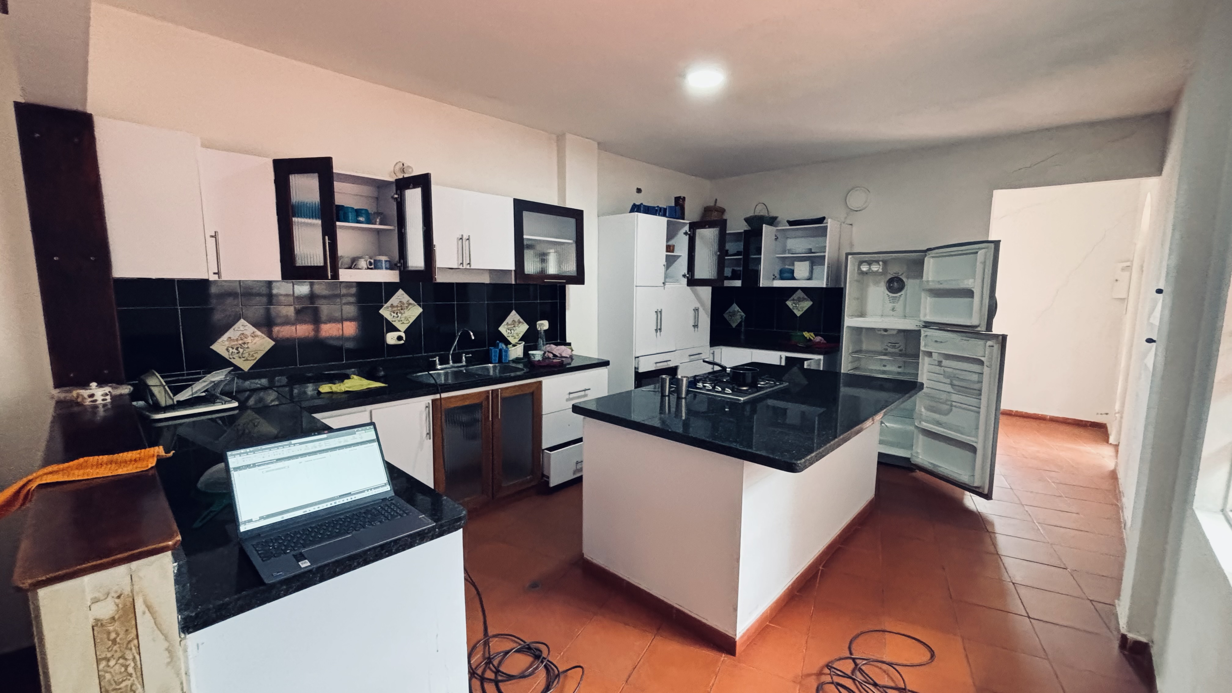 Cocina amplia con estufa en isla de mármol, horno empotrado, y buen almacenaje